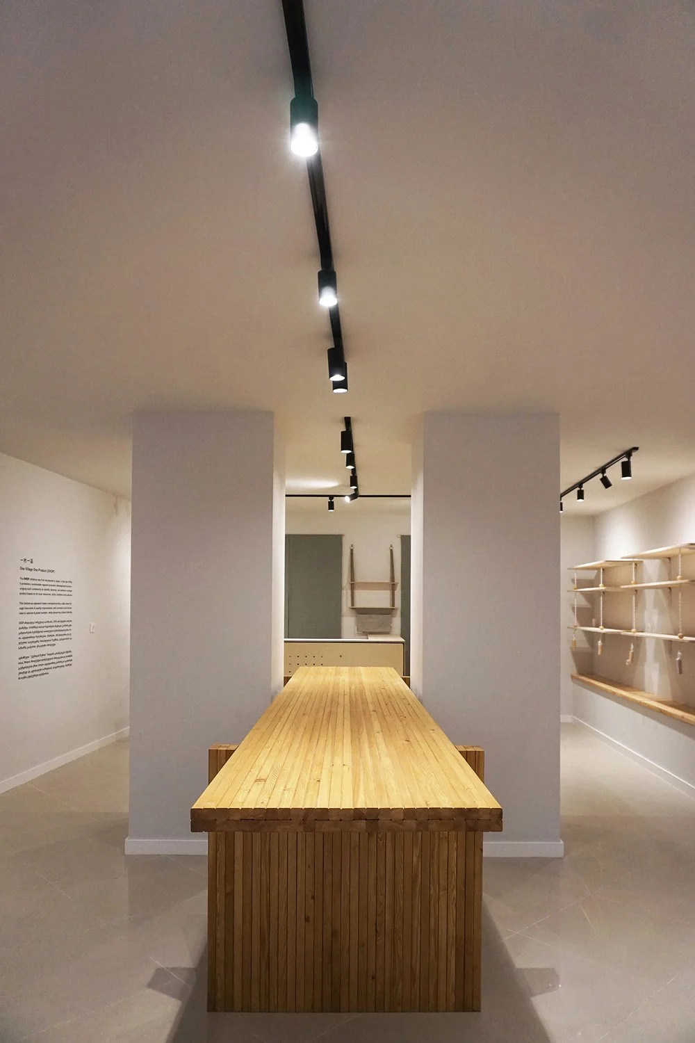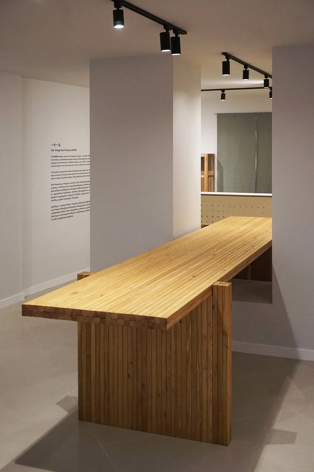We designed a 4-meter-long wooden table for the OVOP Shop in Georgia. OVOP (One Village, One Product) is a Japanese movement that promotes rural development by supporting unique local craftsmanship and resources through modern innovation, and all the shop products are curated from different Georgian villages. Inspired by this concept, we sourced long lamella wood locally, then joined and bonded each piece together. The table was carefully sanded and crafted by the local woodworkers KAO Furniture. The table consists of more than 250 lamellas joined together to form both the top and the legs — yet not a single screw is visible, reflecting the Japanese sense of beauty. Thanks to the precision of the craftsmanship, a hidden structural system has been integrated within each lamella: concealed steel support bars run through each of them, maintaining its strength and form. This innovative detail reinforces the OVOP concept, beautifully blending Georgian identity with Japanese aesthetics.